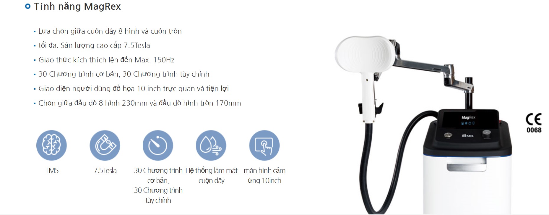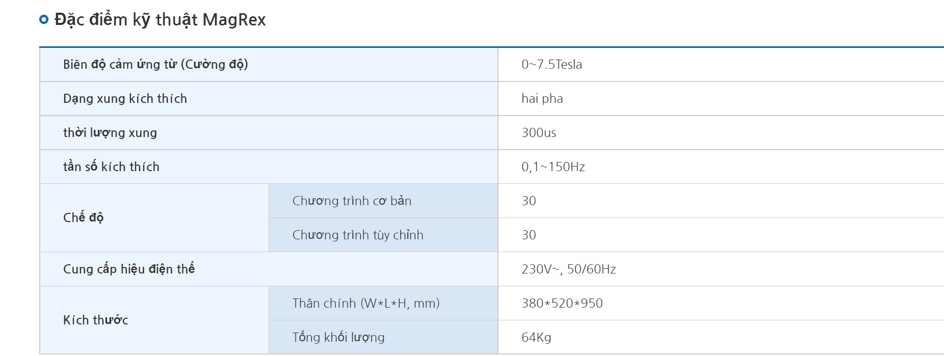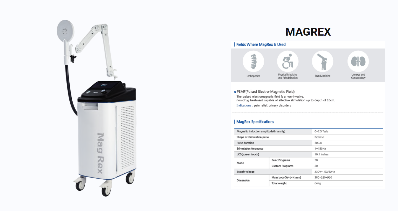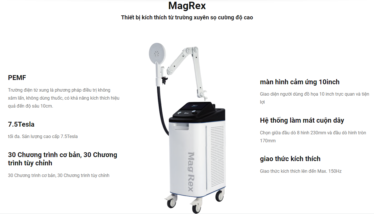 MagRex tạo ra trường điện từ bằng cách đưa dòng điện xung vào cuộn dây điện từ.Kích thích điện từ một cách không tiếp xúc, không xâm lấn, có thể kích thích sâu đến vài cm sâu trong cơ thể người.