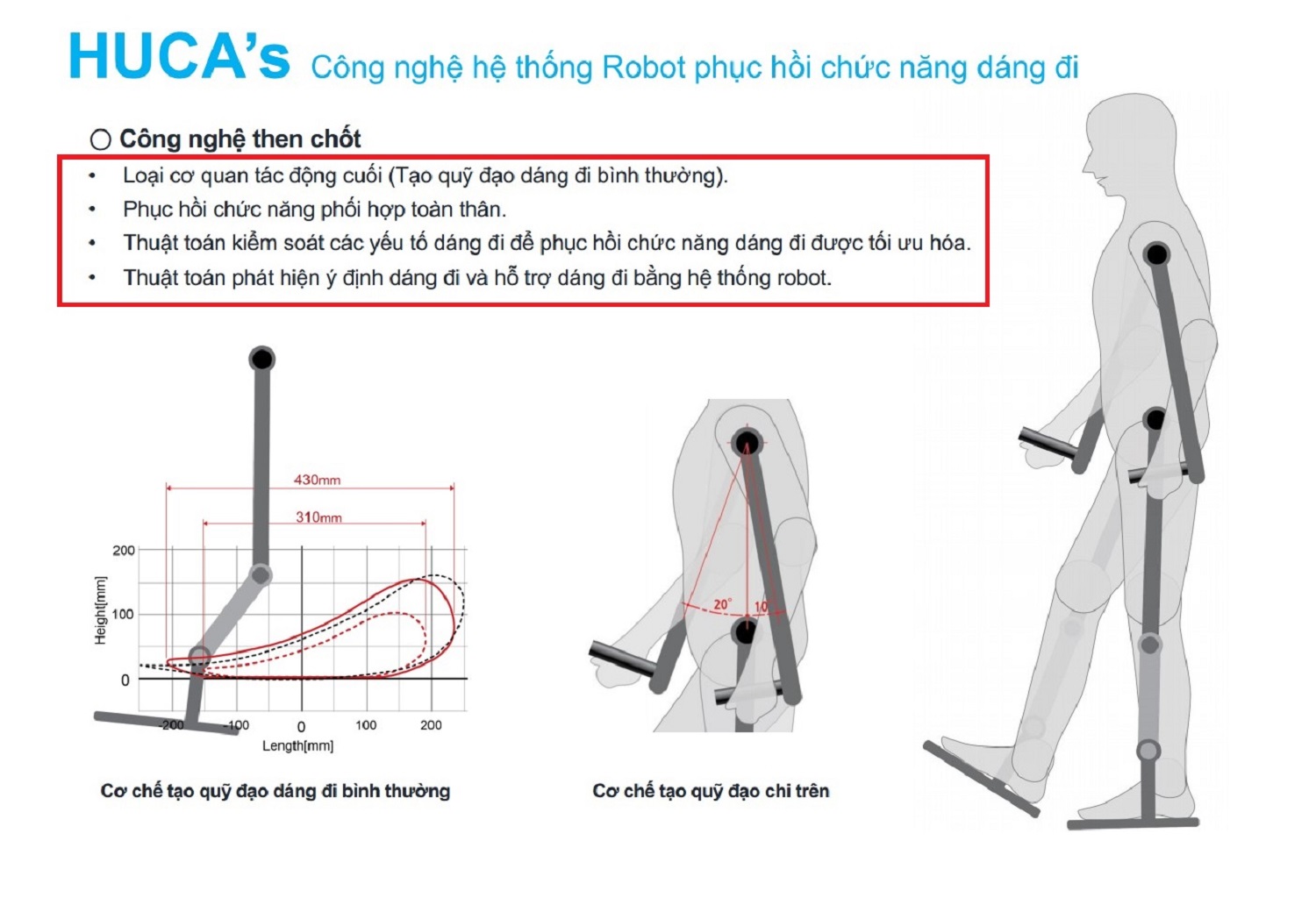 Hệ thống robot tập phục hồi chức năng, huấn luyện và điều chỉnh dáng đi đa chức năng HUCA-Go là hệ thống tổ hợp gồm nhiều thành phần rất hiện đại với các chức năng tập phục hồi chức năng cho chi trên và chi dưới kết hợp toàn thân, huấn luyện điều chỉnh dáng đa chức năng và mở rộng phạm vi hoạt động của sản phẩm. Thiết bị giúp hỗ trợ điều trị phục hồi chức năng cho các bệnh nhân bị liệt, đặc biệt là các bệnh nhân đột quỵ, chấn thương tủy sống; tăng cường hiệu quả phục hồi chức năng, giảm thiểu tối đa các hậu di chứng. Việc ứng dụng công nghệ robot vào phục hồi vận động giúp xử lý được các ca bệnh khó, góp phần đưa chuyên ngành phục hồi chức năng phát triển lên một giai đoạn mới.