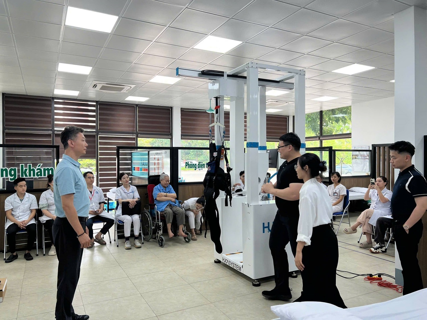 Tại buổi tiếp nhận chuyển giao, các chuyên gia của Công ty HUCA system - Hàn Quốc và kĩ sư của Medical Viet Nam đã hướng dẫn cho bác sĩ, kỹ thuật viên khoa Trị liệu của Bệnh viện Phục hồi chức năng cách vận hành, giúp bệnh nhân thực hiện các bài tập vật lý trị liệu trên hệ thống Robot. Kỹ thuật viên Long Thanh Xuân, Khoa Vật lý trị liệu, Bệnh viện Phục hồi Chức năng tỉnh Lào Cai cho biết sau khi được các chuyên gia hướng dẫn trực tiếp thì chúng tôi cũng đã hiểu về đặc điểm, tính năng kỹ thuật của Hệ thống Robot. Với nhiều tính năng hiện đại, thông minh, khi ứng dụng Hệ thống này không chỉ giúp bệnh nhân thực hiện các bài tập vật lý trị liệu với độ chính xác cao, cường độ phù hợp và sự lặp lại cần thiết mà còn có thể tùy chỉnh để cá thể hoá chức năng, hệ thống robot cũng sẽ ghi nhận lại dữ liệu để theo dõi đánh giá quá trình tiến triển của người bệnh. Đặc biệt là với bộ điều khiển tự động nâng đỡ bệnh nhân sẽ giúp chúng tôi tiết kiệm được công sức rất nhiều trong quá trình hỗ trợ bệnh nhân luyện tập.